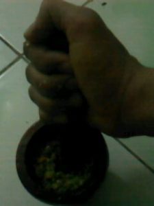 I helped her by pounding the ingredients in this tiny tiny Tbal ( pardon me for my bad English but I don’t know the English word for this and I am lazy checking for it).