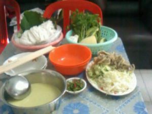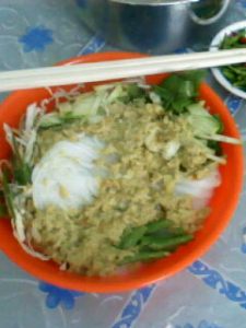 It’s easy. First the veggie, then the noodle and last you pour the Khmer Noodle Soup into the bowl. Oops… did I mention that the soup is made of Pounded fish with Khmer ingredients and coconut milk? The things you see on top is actually fish.